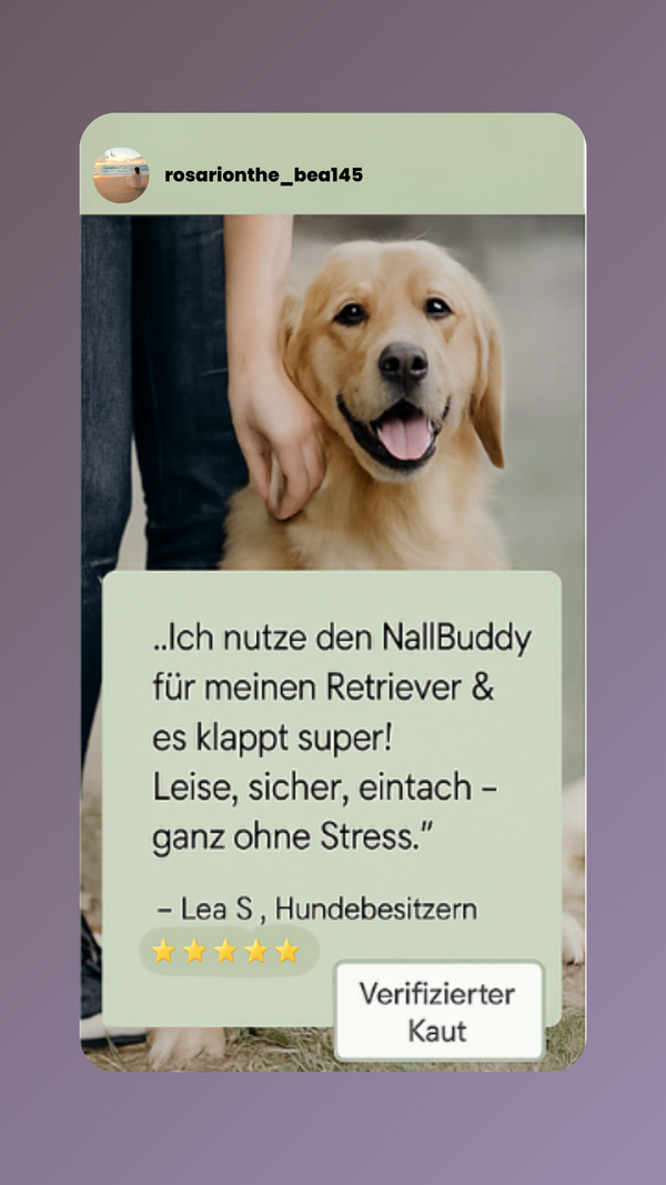 Der NailBuddy wurde fĂŒr genau diese Momente entwickelt: Dein Hund liegt entspannt bei dir, du hĂ€ltst sanft die Pfote und schleifst die Krallen sicher statt zu schneiden. FlĂŒsterleise, mit LED-Licht und Schutzkappe â damit ihr Krallenpflege ohne Angst, Blut und Tierarztstress erlebt.